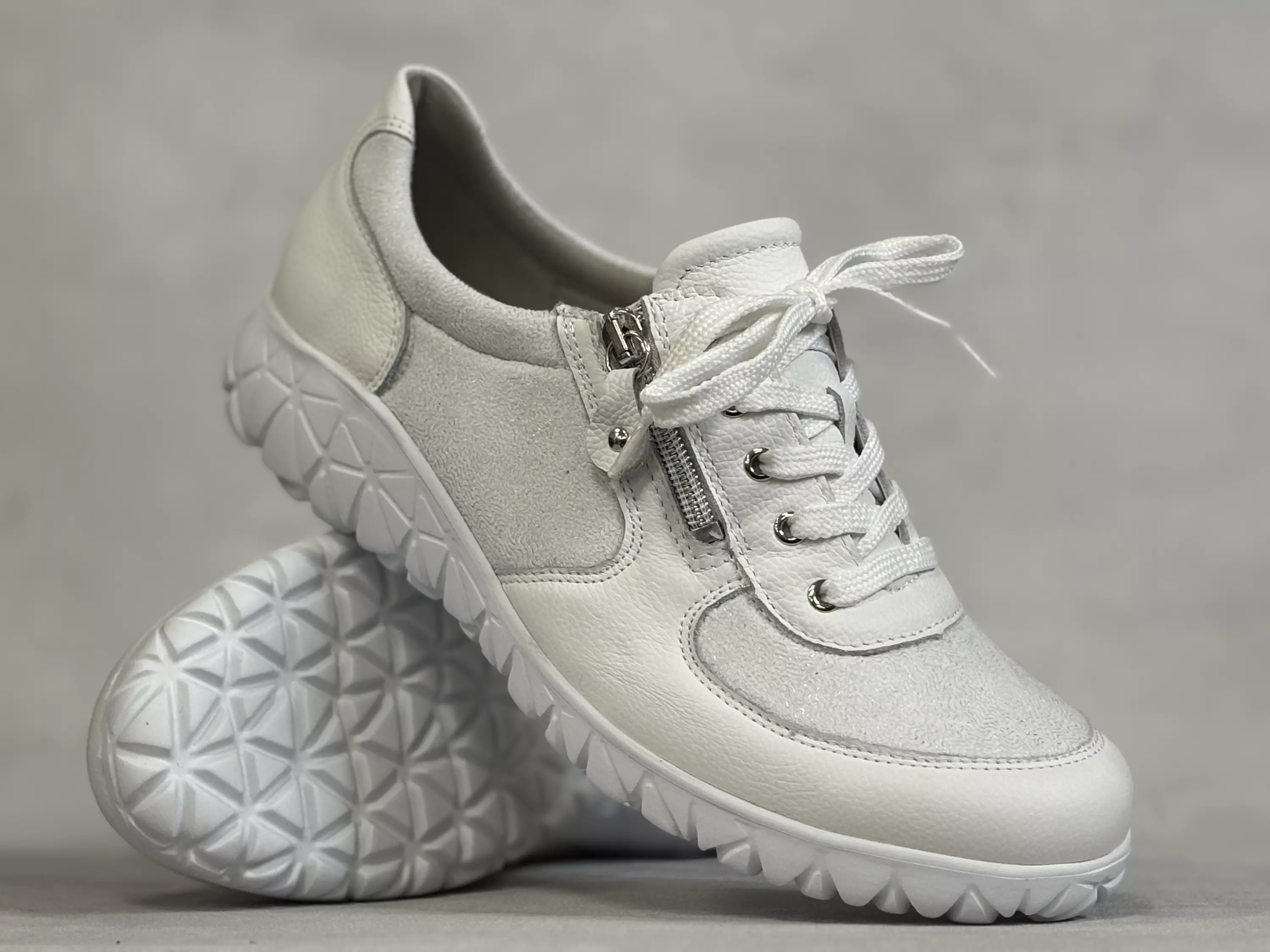 Valkoiset Waldläufer Havy kävelykengät. Nahkaiset kärki- ja kantakappaleet, iltti sekä nauhoituksen ympäristö myös nahkaa. Muutoin tekstiilipintainen kenkä. Sopii mainiosti myös vaivaisenluulliseen jalkaan. Nauhojen avulla kengät on helppo säätää omaan jalkaan sopiviksi ja ulkosyrjälle sijoitettu vetoketju vauhdittaa pukemista. Waldläufer orthotritt-pohjalliset ovat kevyesti muotoillut ja vaihdettavat, joten tarvittaessa sujautat kenkiin omia tarpeitasi parhaiten vastaavat pohjalliset. Lestimioitus leveähkö H. Kannan korkeus noin 3,5cm ja pohjan kokreus päkiän alta noin 1,5cm.