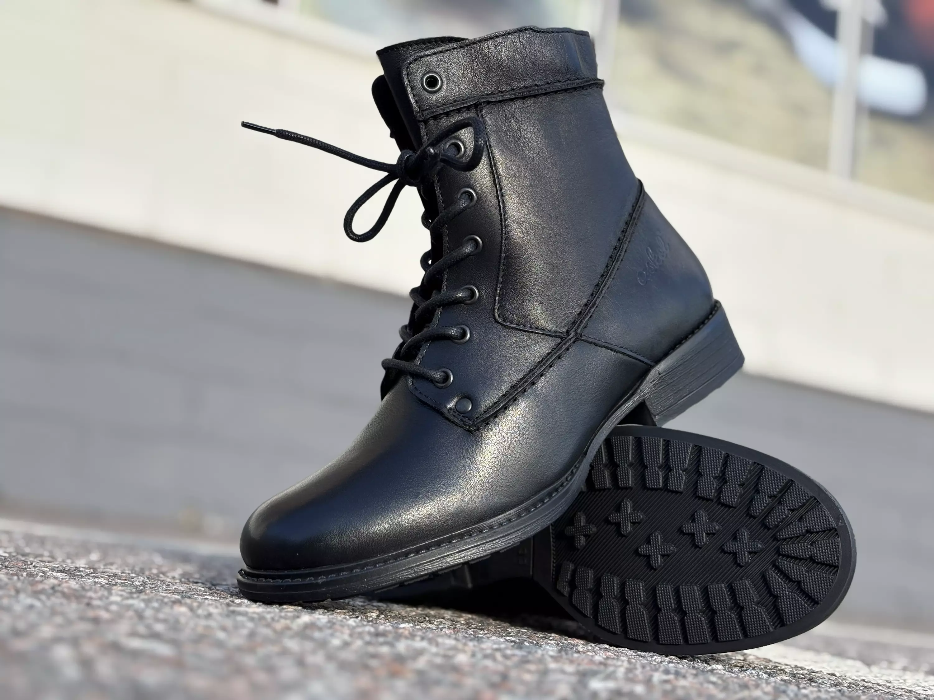 Mustat Askel Saaga nilkkurit. Huopavuoriset nahkanilkkurit sirolla muotoilulla ja näyttävillä pinnan leikkauksilla. Pinnan leikkausten saumakohdat ovat hauskasti kenkien ulkopuolella, joten kengän sisäpuolella ei ole jalkaa painavia saumoja. Sisäsyrjällä pukemista vauhdittava vetoketju ja nauhojen avulla kengät on helppo säätää omaan jalkaan sopivan kireälle. Lestimitoitukseltaan normaalilestinen kenkä. Kannan korkeus noin 3cm ja pohjan korkeus päkiän alta noin 1cm.