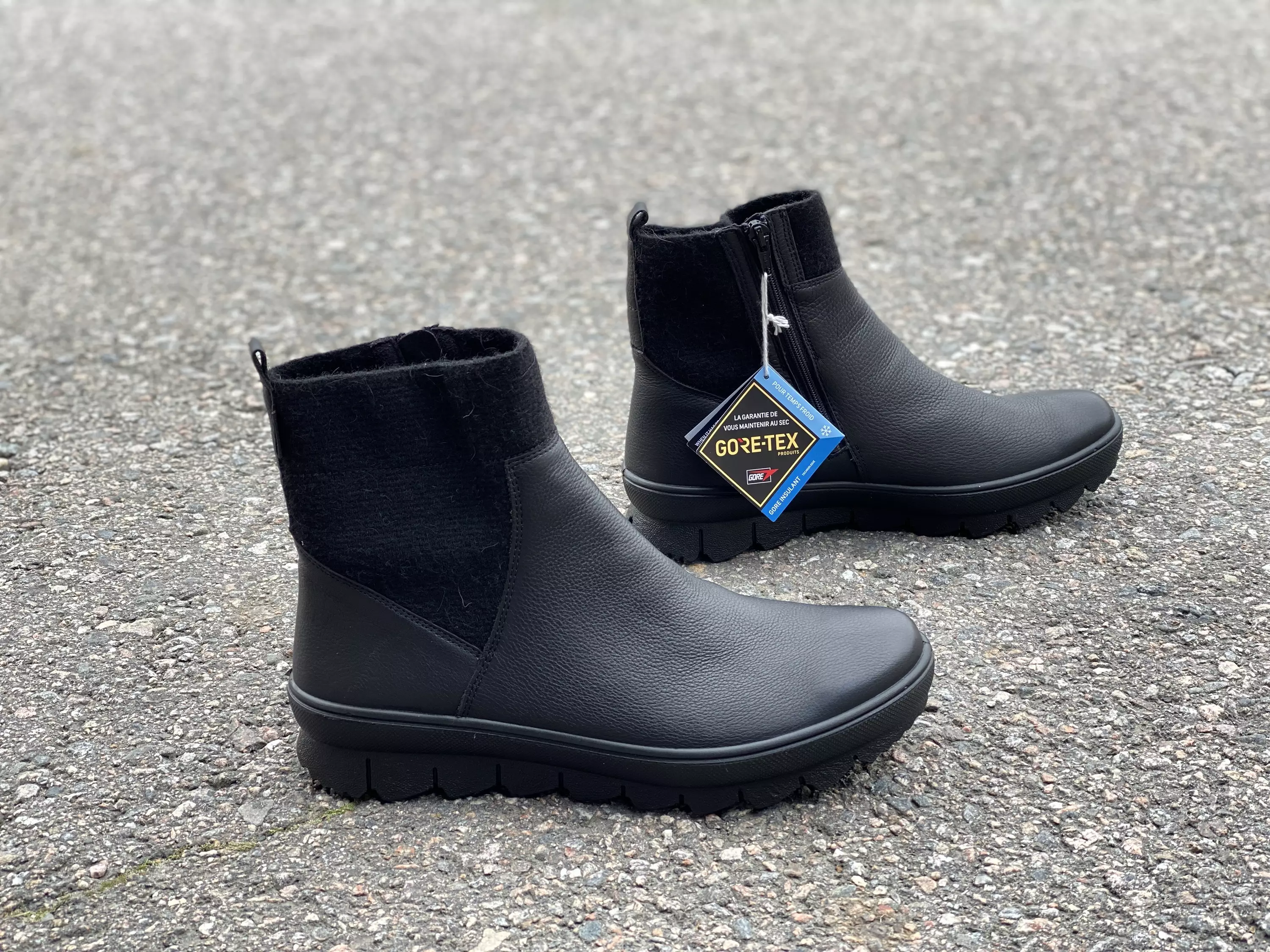 Mustat Legero talvinilkkurit. GORE-TEX pitää varpaat kuivina vaihtelevassa talvisäässä. Pörröisen pehmeä vuori pitää varpaat lämpiminä. Varren yläreuna joustavaa tekstiiliä. Vaihdettava pörröpintainen pohjallinen.