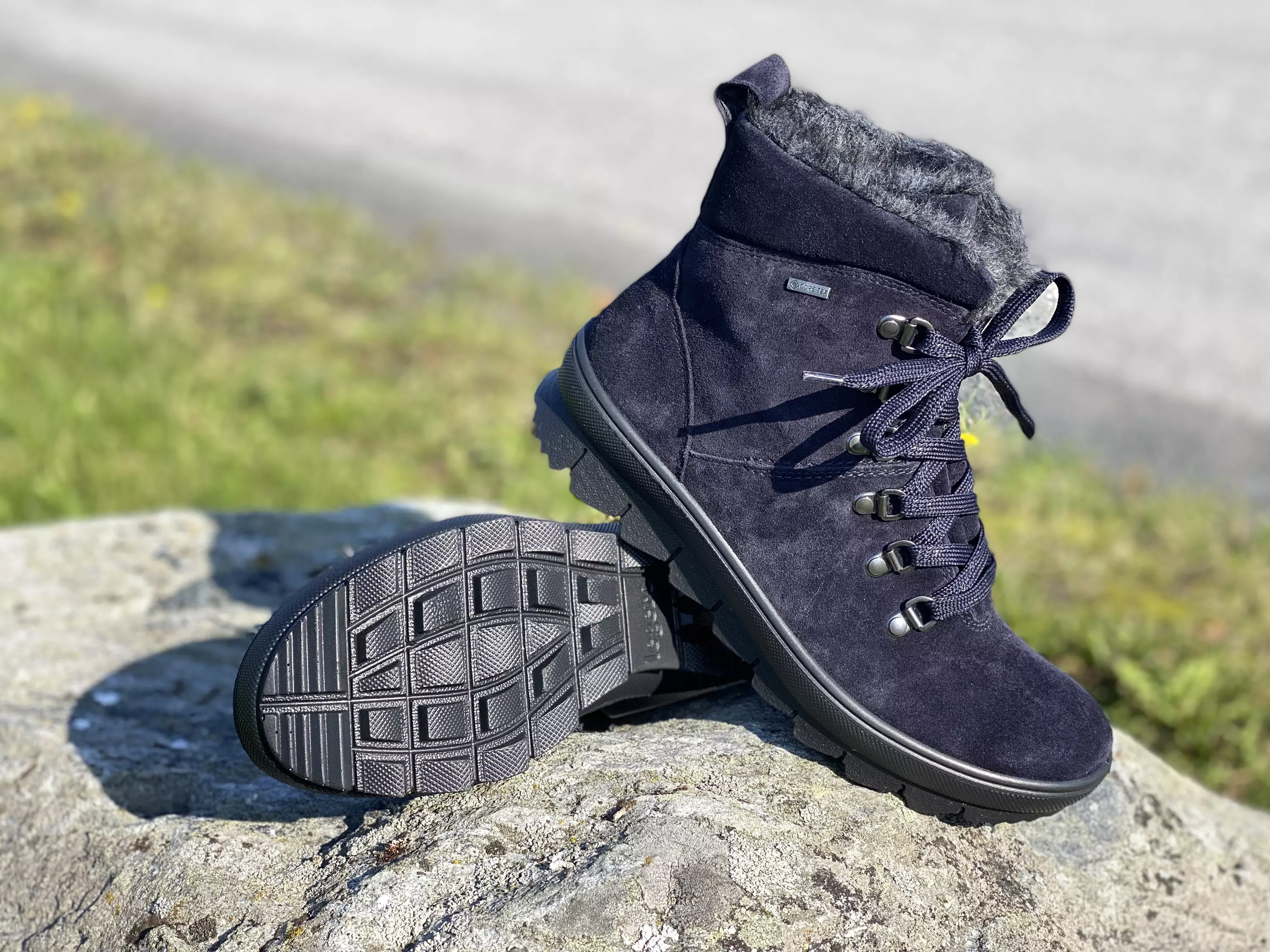 Tummansiniset Legero Oceano GoreTex talvinilkkurit. Näissä mokkanahkaisissa talvikengissä on lämmin pörröinen vuori. Nauhoilla kenkä säätyy sujuvasti sopivaksi omaan jalkaan ja sisäsyrjälle sijoitettu vetoketju helpottaa pukemista. Pörröpintainen pohjallinen on vaihdettavissa, joten sen tilalle sujahtaa omia tarpeitasi parhaiten vastaava pohjallinen.