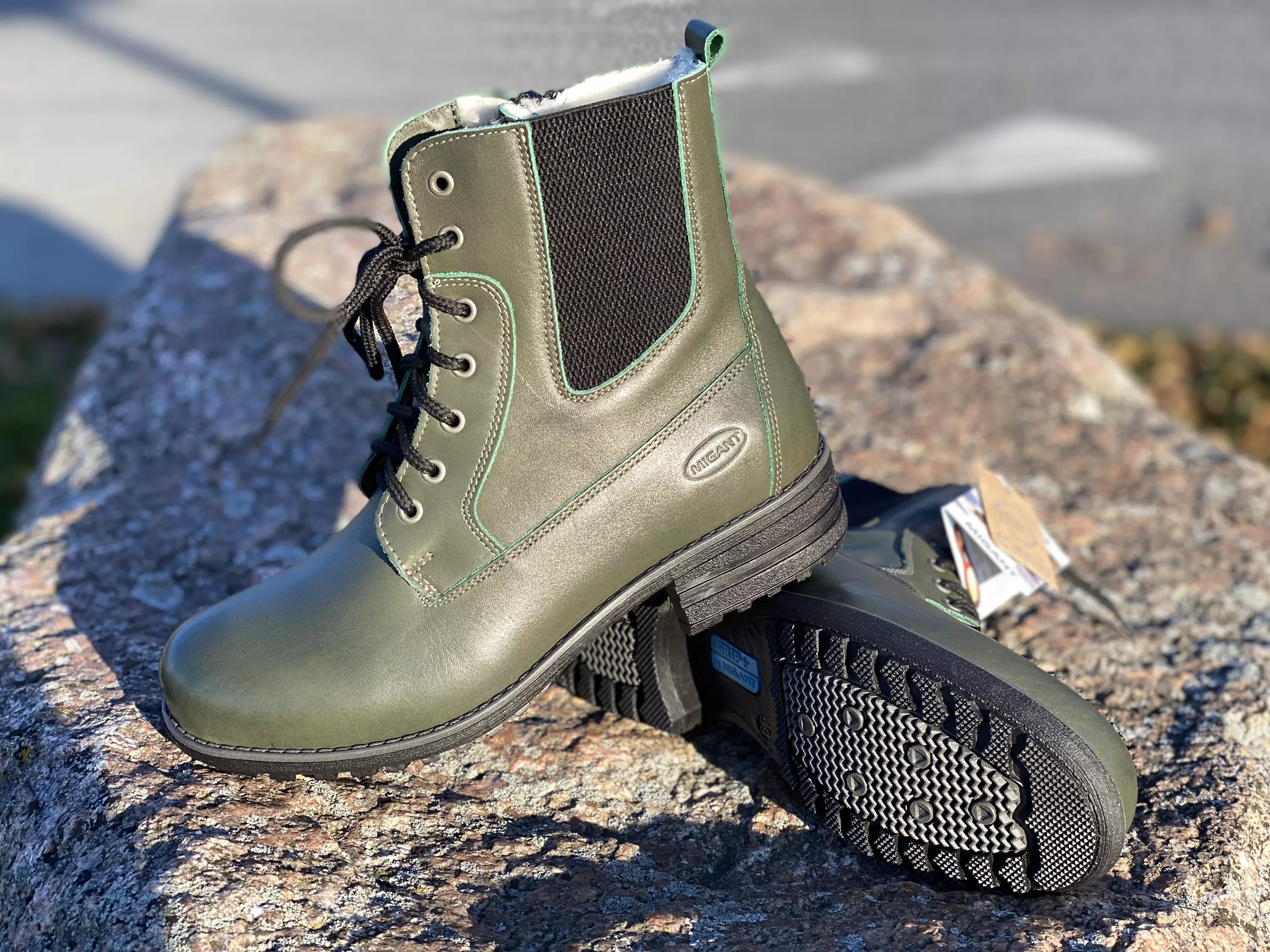 Vihreät Migant Leni maiharit. Nahkaiset maiharit on varustettu villaisella pörrövuorilla, joten jalat pysyvät lämpiminä talven tuiskeissa. Nauhojen avulla kengät säätyvät sopiviksi omaan jalkaan ja sisäsyrjälle sijoitettu vetoketju vauhdittaa pukemista. Ulkosyrjälle sijoitettu venyke toimii niin yksityiskohtana kuin istuvuuden parantajana. Pyöreähkö kärki, jossa on varsin hyvin tilaa varpaille. Pörröpintaiset pohjalliset ovat vaihdettavat, joten tarvittaessa sujautat näihin maihareihin omia tarpeitasi parhaiten vastaavat pohjalliset. Kenkien pinnan tikkaukset antavat näille maihareille ilmettä.