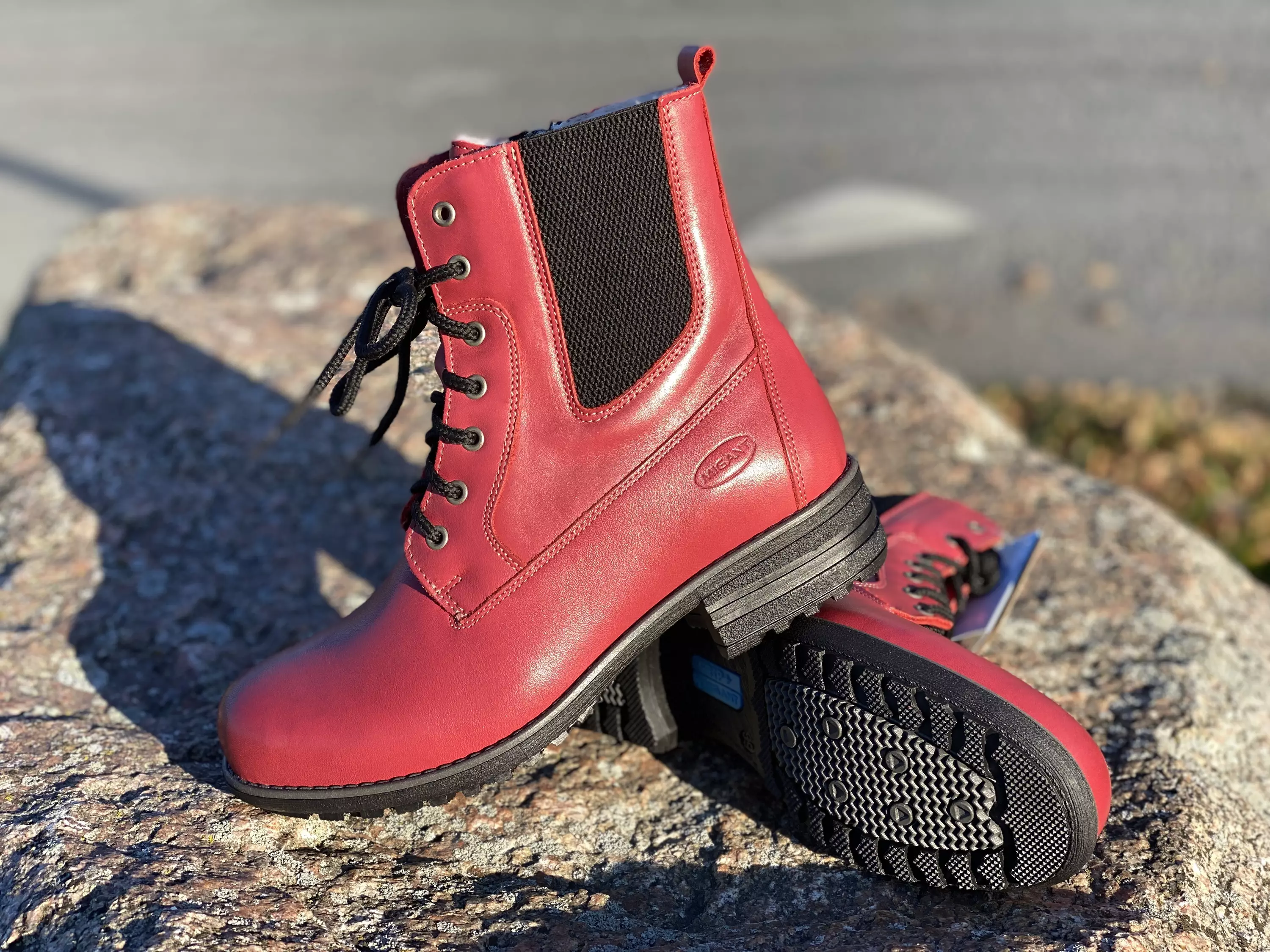 Punaiset Migant Leni maiharit. Nahkaiset maiharit on varustettu villaisella pörrövuorilla, joten jalat pysyvät lämpiminä talven tuiskeissa. Nauhojen avulla kengät säätyvät sopiviksi omaan jalkaan ja sisäsyrjälle sijoitettu vetoketju vauhdittaa pukemista. Ulkosyrjälle sijoitettu venyke toimii niin yksityiskohtana kuin istuvuuden parantajana. Pyöreähkö kärki, jossa on varsin hyvin tilaa varpaille. Pörröpintaiset pohjalliset ovat vaihdettavat, joten tarvittaessa sujautat näihin maihareihin omia tarpeitasi parhaiten vastaavat pohjalliset. Kenkien pinnan tikkaukset antavat näille maihareille ilmettä.