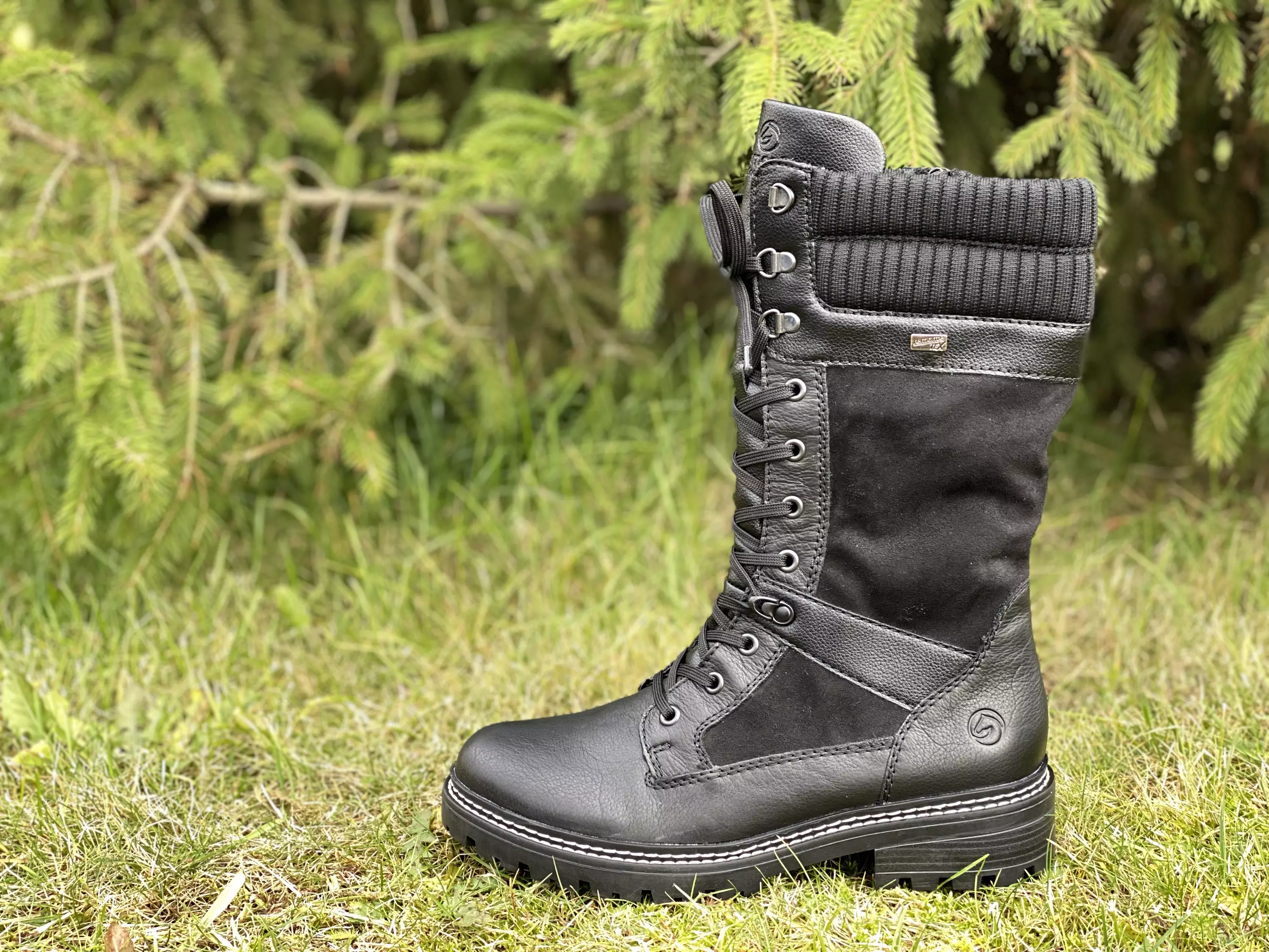 Mustat Remonte talvisaappaat. Remonte-Tex kalvon ansiosta varpaat pysyvät kuivina ja villavuoren avulla lämpiminä. Iltin yläreuna sileää teddykangasta. Varren yläreunan neuleosio ja pinnan leikkaukset antavat saappaille ilmettä. Sisäsyrjän vetoketju helpottaa pukemista ja nauhat sopivuuden säätämistä omaan jalkaan. Ulkopohjassa on vihreä pitoa tarjoava Extra Grip alue.