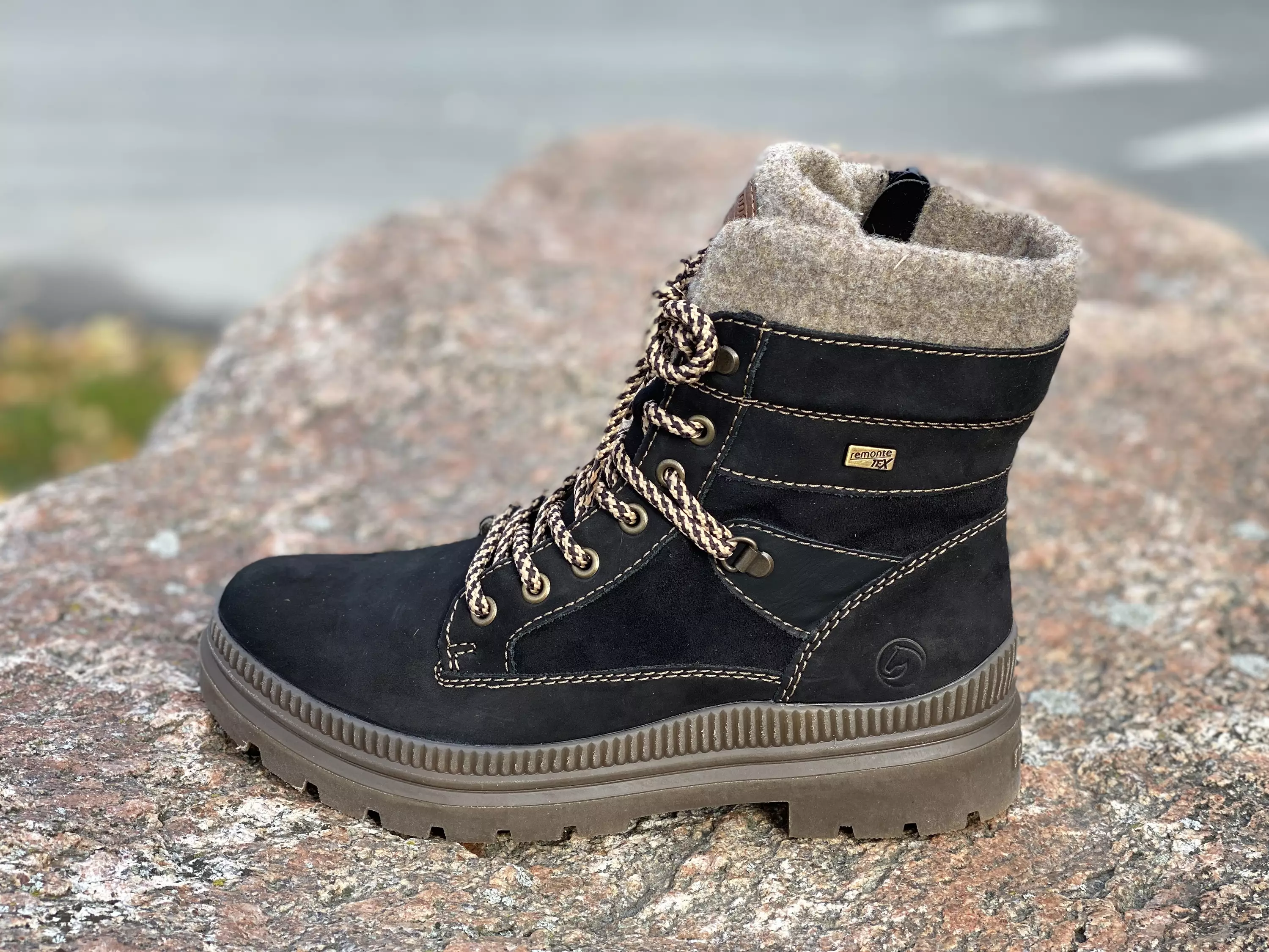 Mustat Remonte talvinilkkurit. RemonteTEX kalvo pitää kosteuden kengänt ulkopuolella. Nahkainen pinta ja pörröinen sisävuori (villaa). Nauhoilla kenkä säätyy sujuvasti omaan jalkaan sopivaksi ja sisäsyrjän vetoketju helpottaa pukemista. Varren yläreunassa huopaosio. Pinnan leikkaukset tuovat kenkään runsaasti ilmettä ja kaksiväriset musta-ruskeat nauhat viimeistelevät lookin. Pörröpintainen irrotettava pohjallinen, jonka tilalle sujahtaa tarpeen vaatiessa omaan jalkaasi parhaiten istuva pohjallinen. Pohjassa extra pitoa tarjoavat alueet,