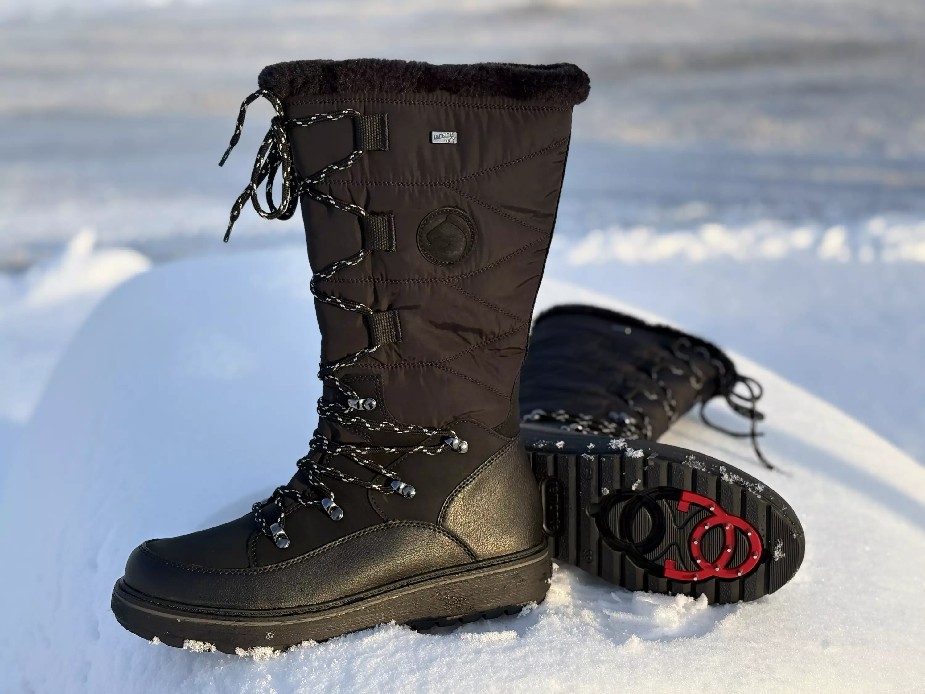 Mustat Remonte talvisaappaat. Pörröisellä villavuorilla varustetut talvikengät pitävät jalat lämpöisinä. Käännettävillä nastoilla varustetut talvisaappaat ovat omiaan lisäämään talviturvallisuutta. RemonteTex kalvo pitää kosteuden ja tuulentuiskeen kengän ulkopuolella.