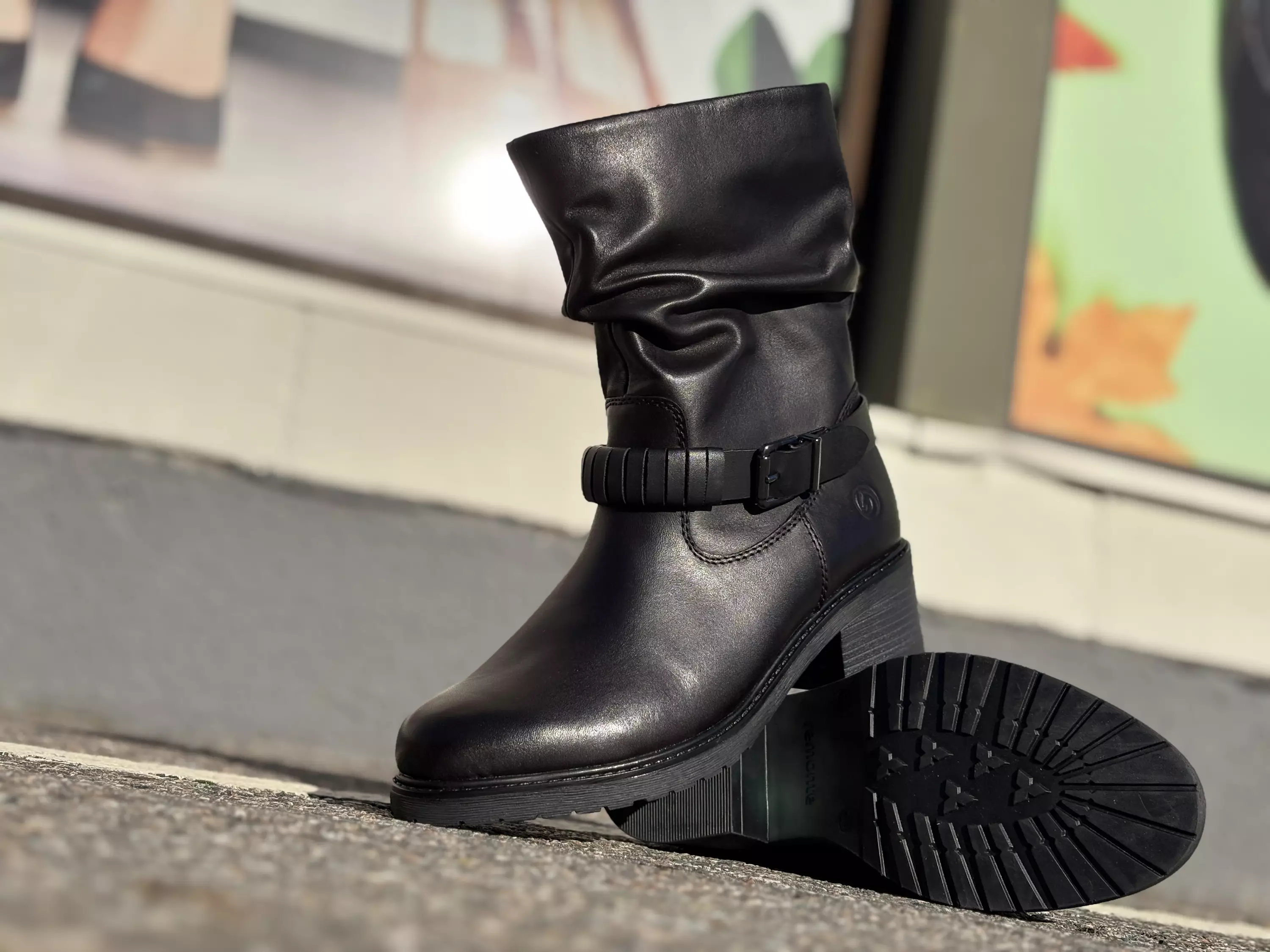 Mustat Remonte nilkkurit. Matalakorkoiset nahkanilkkurit. Tyylikäs rypytetty varsi. Nilkan ympärillä soljellinen koristeremmi. Varren yläsassa matalanukkainen tekoturkisvuori, kärjessä lämmin lammasturkisvuori. Sisäsyrjällä pukemista helpottava ja vauhdittava vetoketju. Lestimitoitus kapeahko F½. Kannan korkeus noin 5cm ja pohjan korkeus päkiän alta noin 1,5cm.
