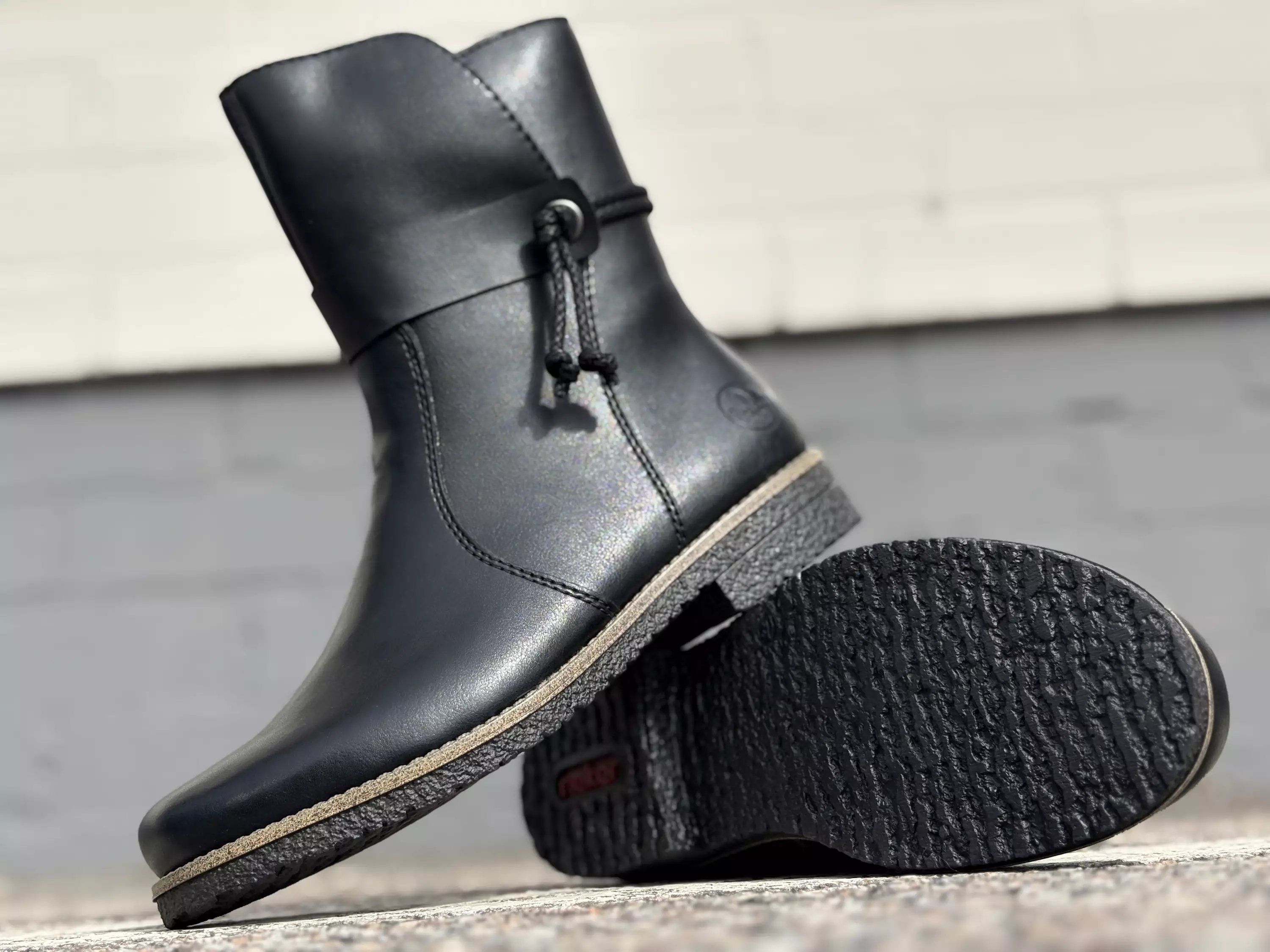 Mustat Rieker saapikkaat. Talvisaapikkaat, joiden varressa on yksityiskohtana remmi, joka yhdistyy kengän sivulla nyöriin. Solmukohta ja nyörin roikkuvat päät jäävät sieväksi yksityiskohdaksi kengän ulkosyrjälle. Teddytekstiilinen sisävuori, joka auttaa jalkoja pysymään lämpiminä talven tuiskeissa. Ulkosyrjällä yläreunassa istuvuutta parantava halkio. Sisäsyrjällä pukemista vauhdittava vetoketju. Kannan korkeus noin 3cm ja pohjan korkeus päkiän alta noin 1,5cm.