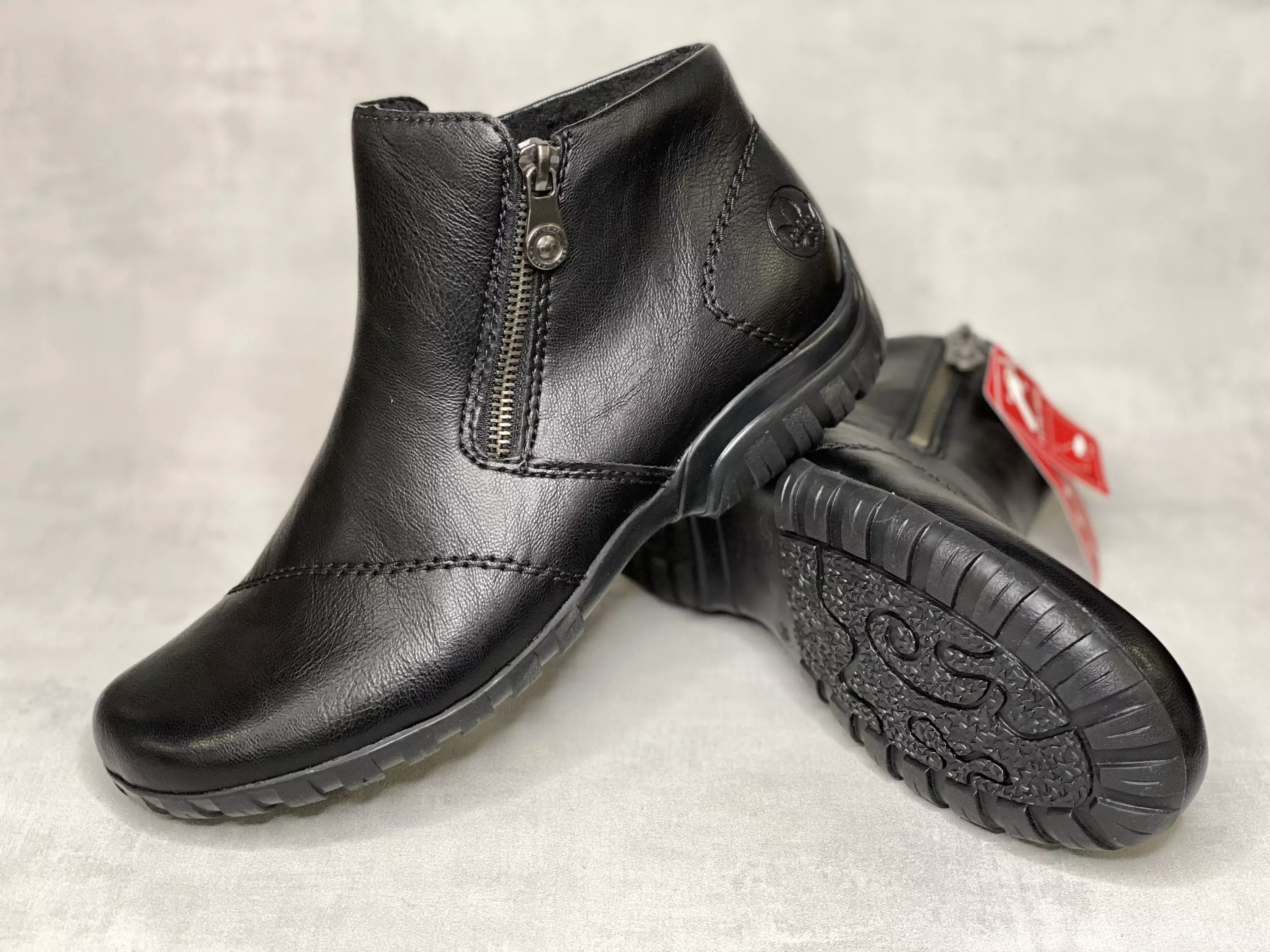 Mustat Rieker talvinilkkurit. Kahdella vetoketjulla varustetut pörrövuoriset nilkkurit. Huopapintaiset pohjalliset ovat vaihdettavat, joten tarvittaessa sujautat kenkiin omia tarpeitasi parhaiten vastaavat pohjalliset.