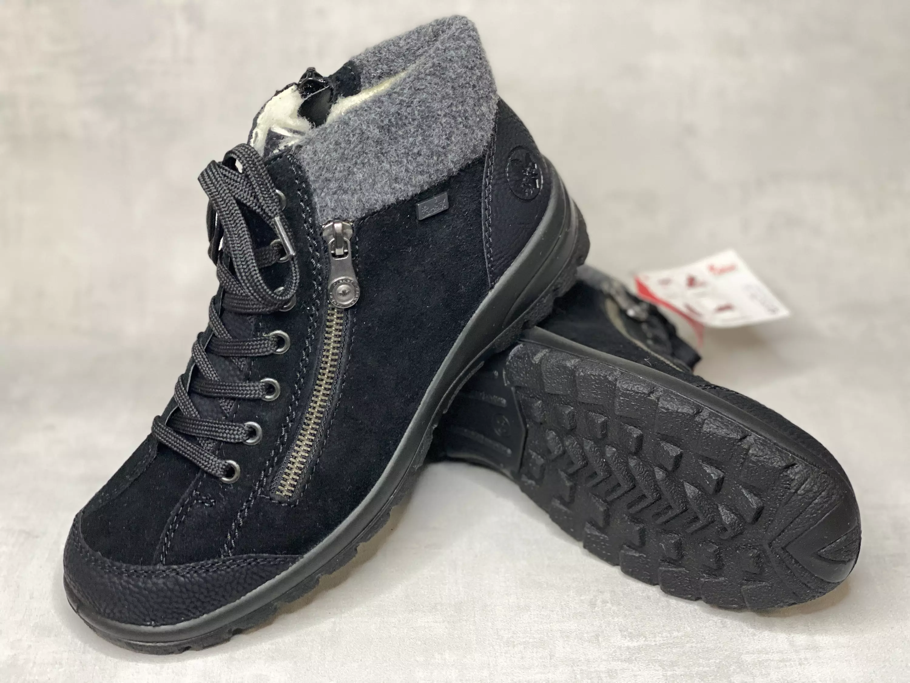 Mustat Rieker nilkkurit. Pörrövuoriset talvinilkkurit, joissa ulkosyrjälle sijoitettu koristevetoketju ja sisäsyrjälle sijoitettu pukemista helpottava vetoketju. Nauhojen avulla kengät on helppo kiristää jalkaan. RiekerTex pitää varpaat kuivina vaihtelevissa sääolosuhteissa.