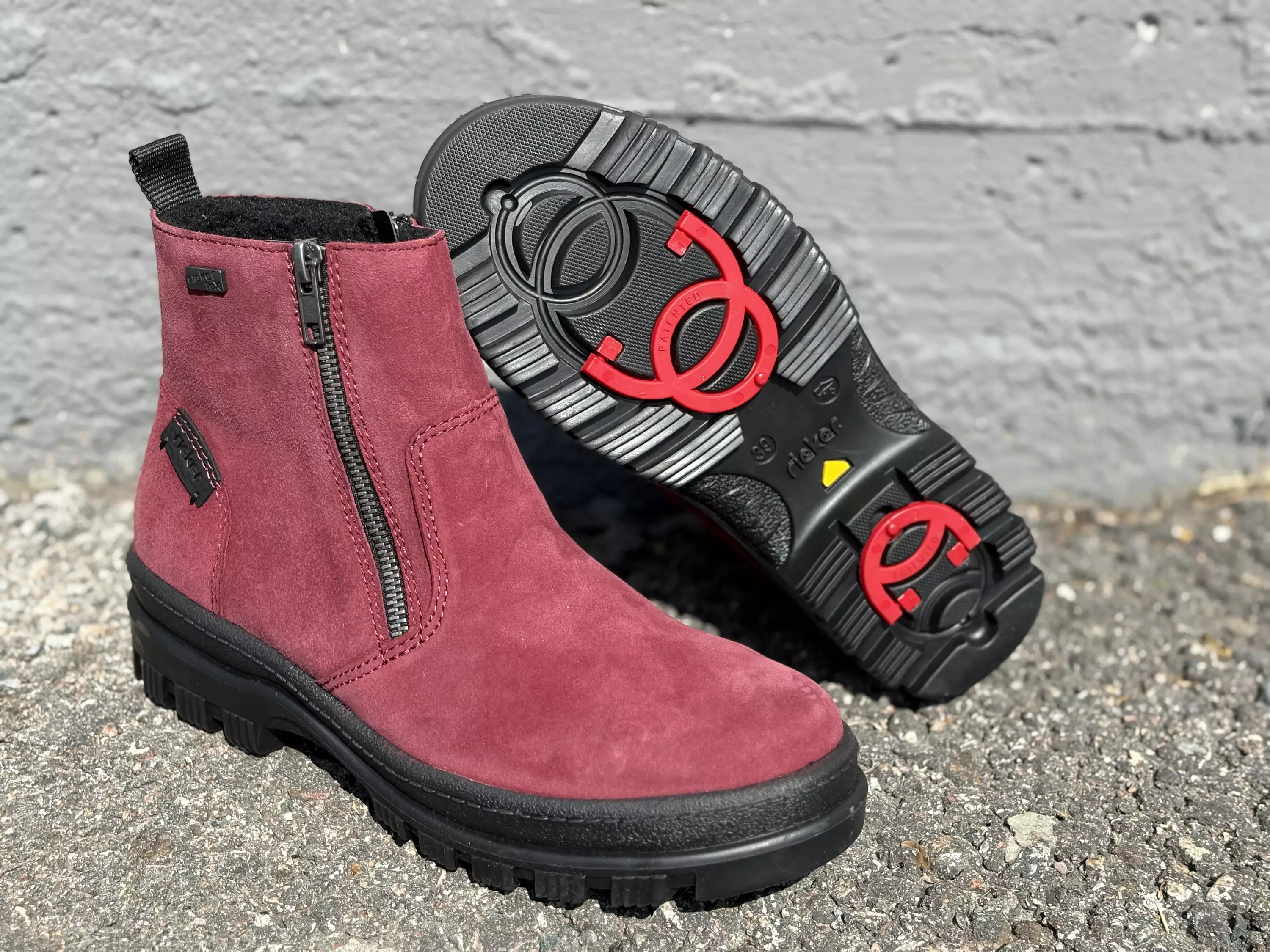 Punaiset talvinilkkurit Rieker mallistosta. Pörröinen sisävuori pitää varpaat lämpöisinä. Sisä- ja ulkosyrjille sijoitetut vetoketjut helpottavat pukemista ja tiivistävät kengät jalan ympärille. Vaihdettavan pohjallisen tilalle sujahtaa tarittaessa omaan jalkaasi parhaiten sopiva pohjallinen. Ulkopohjassa nastat, jotka voi tarpeen vaatiessa kääntää käyttöön tai pois käytöstä.