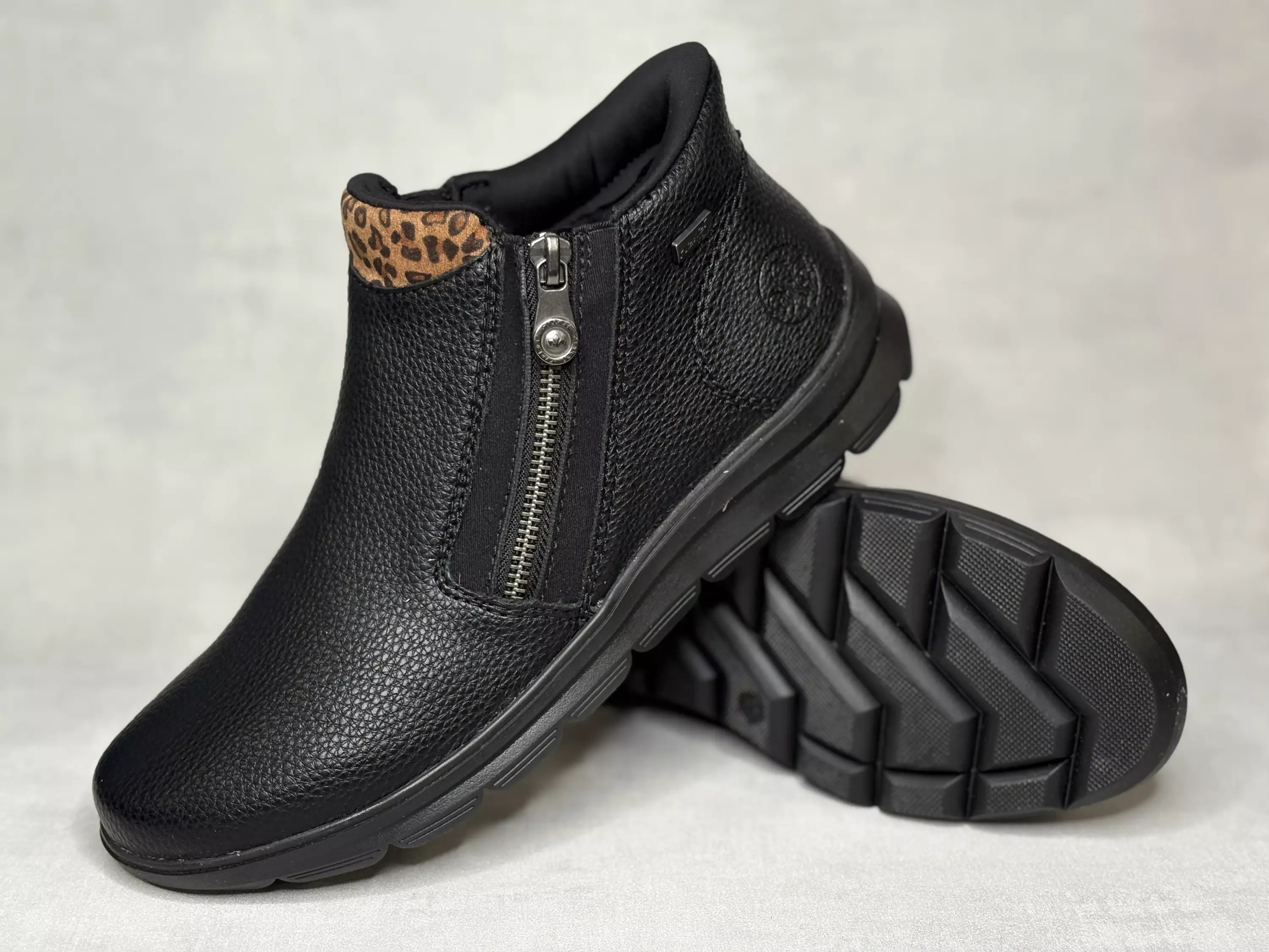 Mustat Rieker nilkkurit. Ready2Go kenkälusikkakannalla varustetut talvinilkkurit. Keskellä edessä varrensuussa pieni leopardikuosinen yksityiskohta. Nilkkureiden sisäsyrjällä on venyke. Ulkosyrjälle ommeltu vetoketju, jonka ylä- ja alapuolella venykekaitale. Pörröinen tekstiilivuori. RiekerTex pitää tuulen tuiskeen sekä kosteuden kenkien ulkopuolella. Rieker antistress pohjalliset ovat vaihdettavat, joten tarvittaessa sujautat näihin kenkiin omia tarpeitasi parhaien vastaavat pohjalliset. Kannan korkeus noin 3cm ja pohjan korkeus päkiän alta noin 1,5cm.