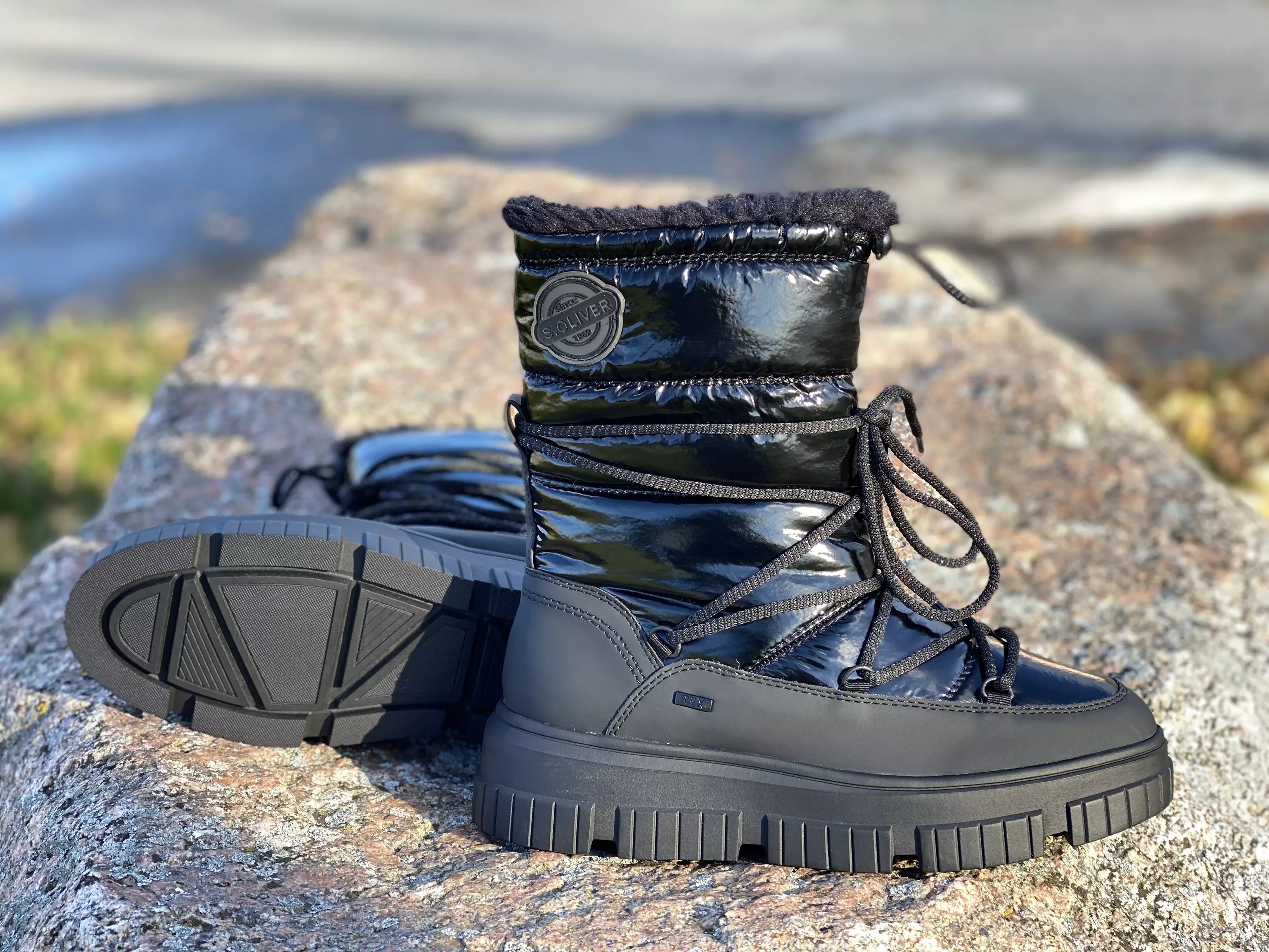 Mustat S.Oliver talvisaappaaat. Pörheällä tekstiilivuorilla varustetut kiiltävät korkeavartiset talvisaappaat. Myös sisäpohjan pinta on pörheä. Sisäsyrjällä pukemista vauhdittava vetoketju. Kevyesti kiiltävät nauhat ovat enemmän koristeena, mutta kyllä niillä tarvittaessa kiristää varren kireyttä, jos kenkä uhkaa pyöriä hoikassa sääressä. Varren yläreunassa on myös kiristyspampulalla varustettu nyöri, joten tarvittaessa kiristät varrensuun tiukemmalle, ettei lumi livahda kengän sisäpuolelle. Kosteudelta suojaava Tex-kalvo, mutta muista silti ettei tämä ole kumisaapas. Kannan korkeus noin 4,5cm ja pohjan korkeus päkiän alta noion 2,5cm.
