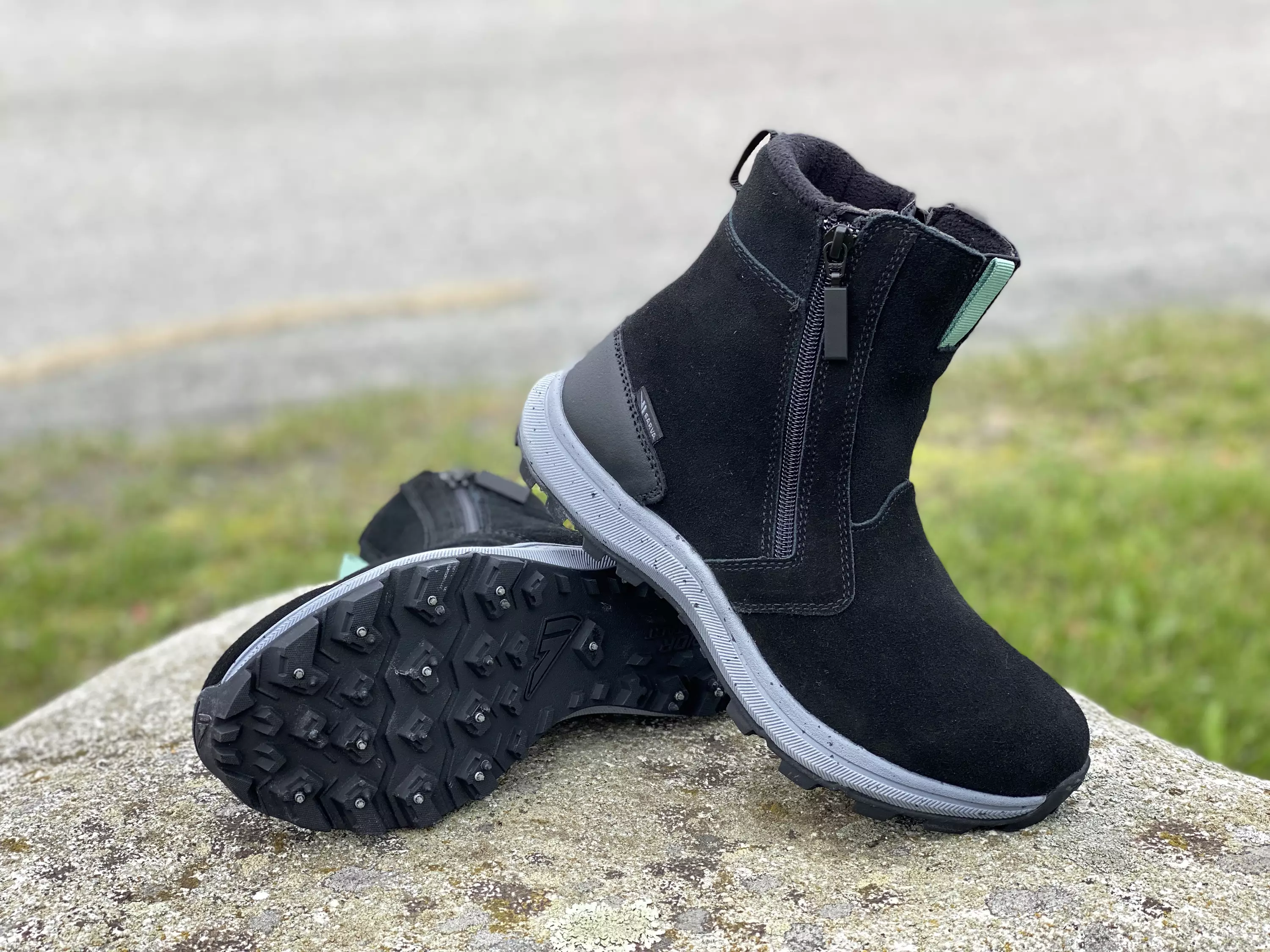 Mustat Sarva ADA nastakengät. Kahdella vetoketjulla varustetut nastapohjaiset nilkkurit. Varren yläosassa on vetolenkit sekä edessä että takana, etuosan vetolenkin alla on joustava venyke. Tekstiilivuoriset nastakengät, joissa on kevyesti muotoillut pohalliset, joiden tilalle vaihdat tarvittaessa omia tarpeitasi parhaiten vastaavat pohjalliset. Kenkien pohjakuviointi on suunniteltu erityisesti epätasaisille ja liukkaille pinnoille. Kovametallipäiset nastat antavat erinomaisen pidon sekä kestävät kulutusta.