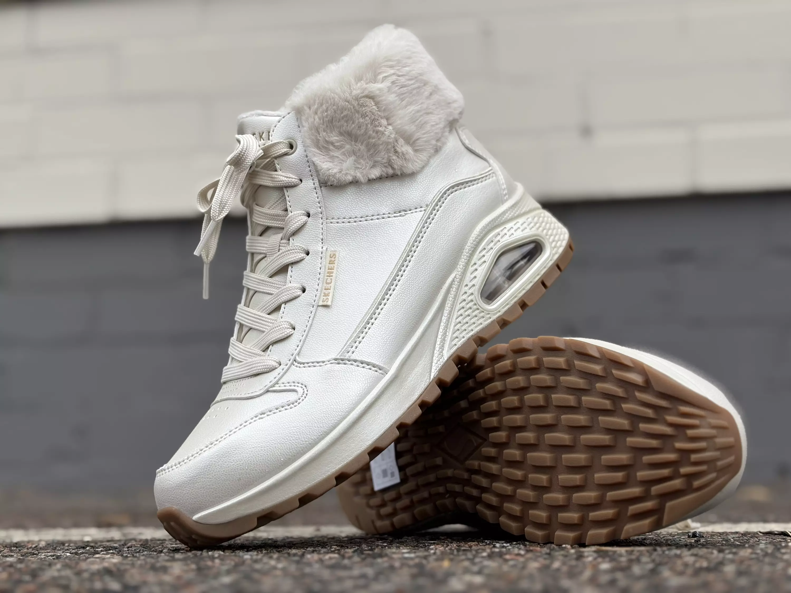 Helmenvalkoiset Skechers 167821OFWT - Uno Rugged - Galactic Heights - Off White talvinilkkurit. Sievällä tekoturkissomisteella koristettu talvikenkä. Valkoinen helmiäisenkiiltoinen pinta. Nauhojen avulla nilkkurit on helppo säätää omaan jalkaan sopivan kireälle ja sisäsyrjälle sijoitettu vetoketju vauhdittaa pukemista. Jalan alla mukautuvat Skechers Air-Cooled Memory foam-pohjalliset. Kannassa iskuja vaimentava, muistakin Skechers Uno-jalkineista tuttu ilmakupla. Lestimitoitus normaali, Skechers Classic fit. Kannan korkeus noin 4cm ja pohjan korkeus päkiän alta noin 2cm.